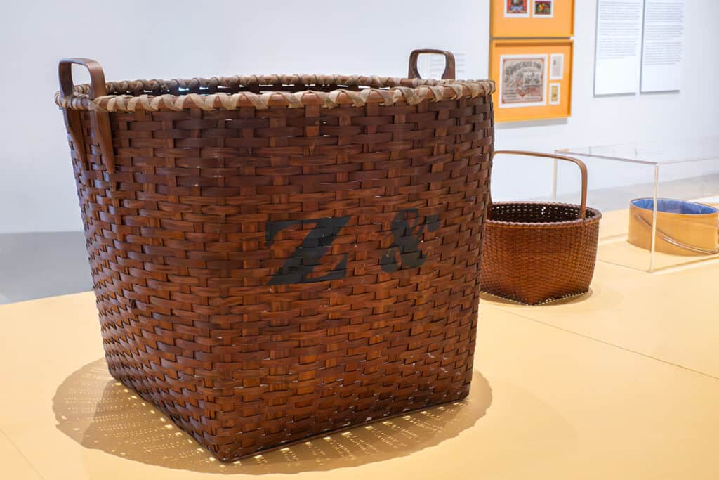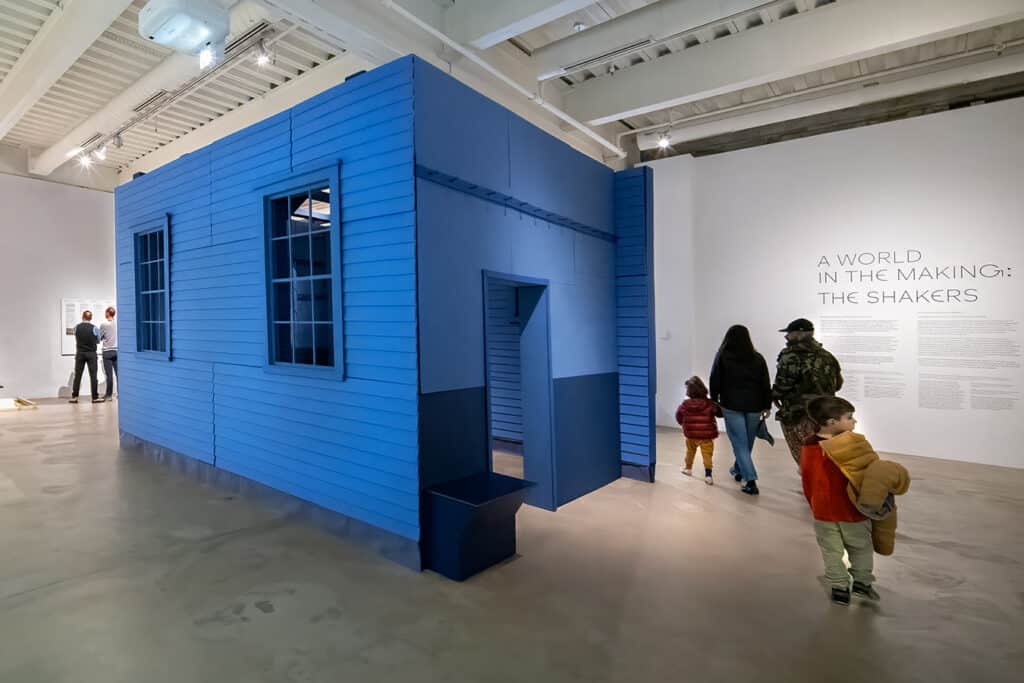 This exhibit is at the Institute of Contemporary Art (ICA), a department of the University of Pennsylvania, and continues until August 9, 2026. In keeping with ICA’s usual focus on experimental and under-recognized contemporary art, it opens with an abstract walk-in cardboard shaker meeting house created by Amie Cunat, a faculty member at Fordham University and The Cooper Union in New York. It then expands into the main gallery that is an ode to the 19th century traditions and artistic genius of the Shaker craftspeople.