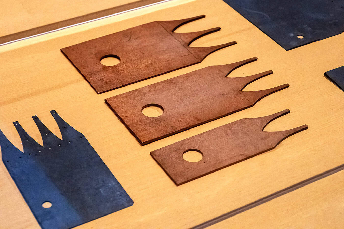 The ICA exhibit not only features samples of the pantry boxes themselves but the precision tools and templates that were used to make them.
