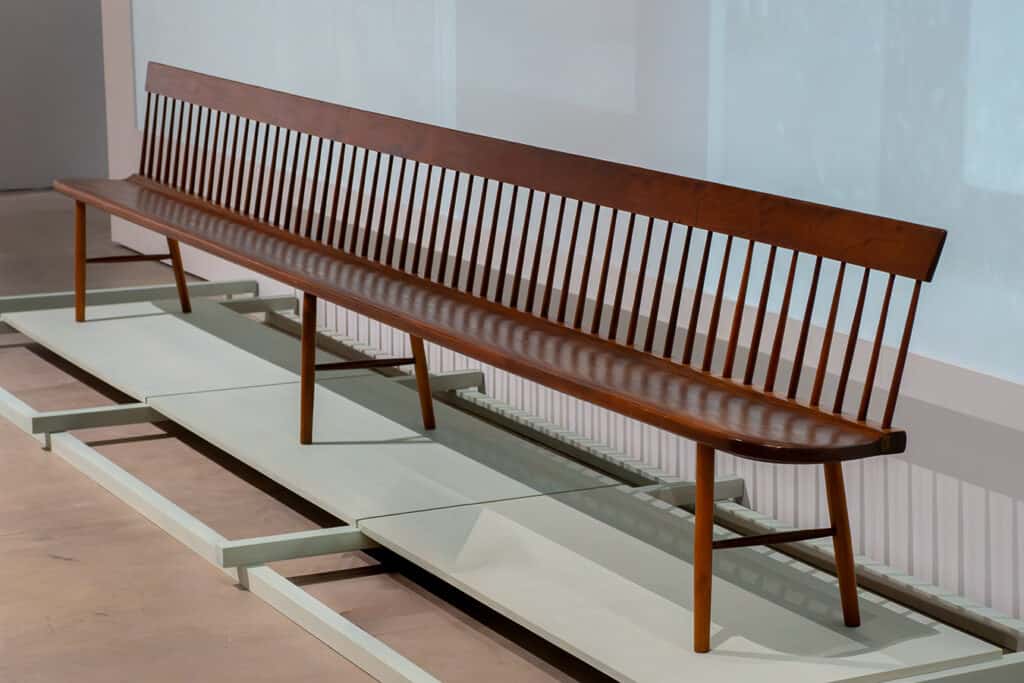For their meeting houses and dining halls, the Shakers made remarkably long-benches—sometimes exceeding 12 to 20 feet using the same post-and-round construction methods of their iconic chairs