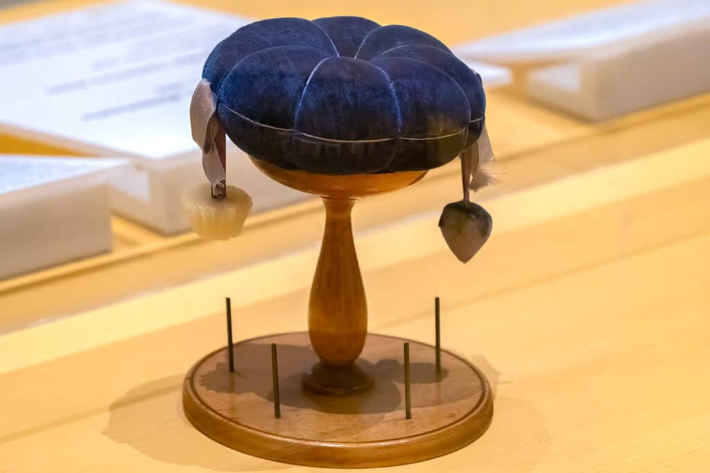 Shaker craftsmen also produced finely made accessories for women engaged in sewing and other needlework. Each element had a practical function, reflecting the Shaker commitment to usefulness and thoughtful design. This velvet-and leather-covered pincushion, intended to be mounted on a table, is a particularly elegant example of that approach.