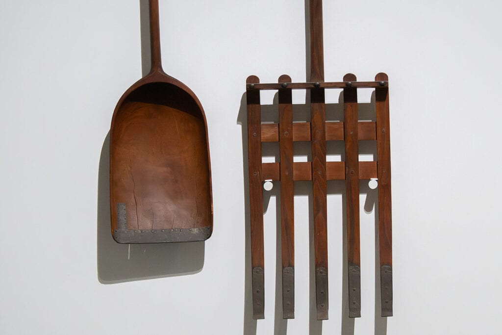 The material culture created by the Shakers assumed that all the physical objects of daily life would be made as part of a devotion to high quality and artistic excellence. Here are a handmade seed shovel and seed gathering rake.